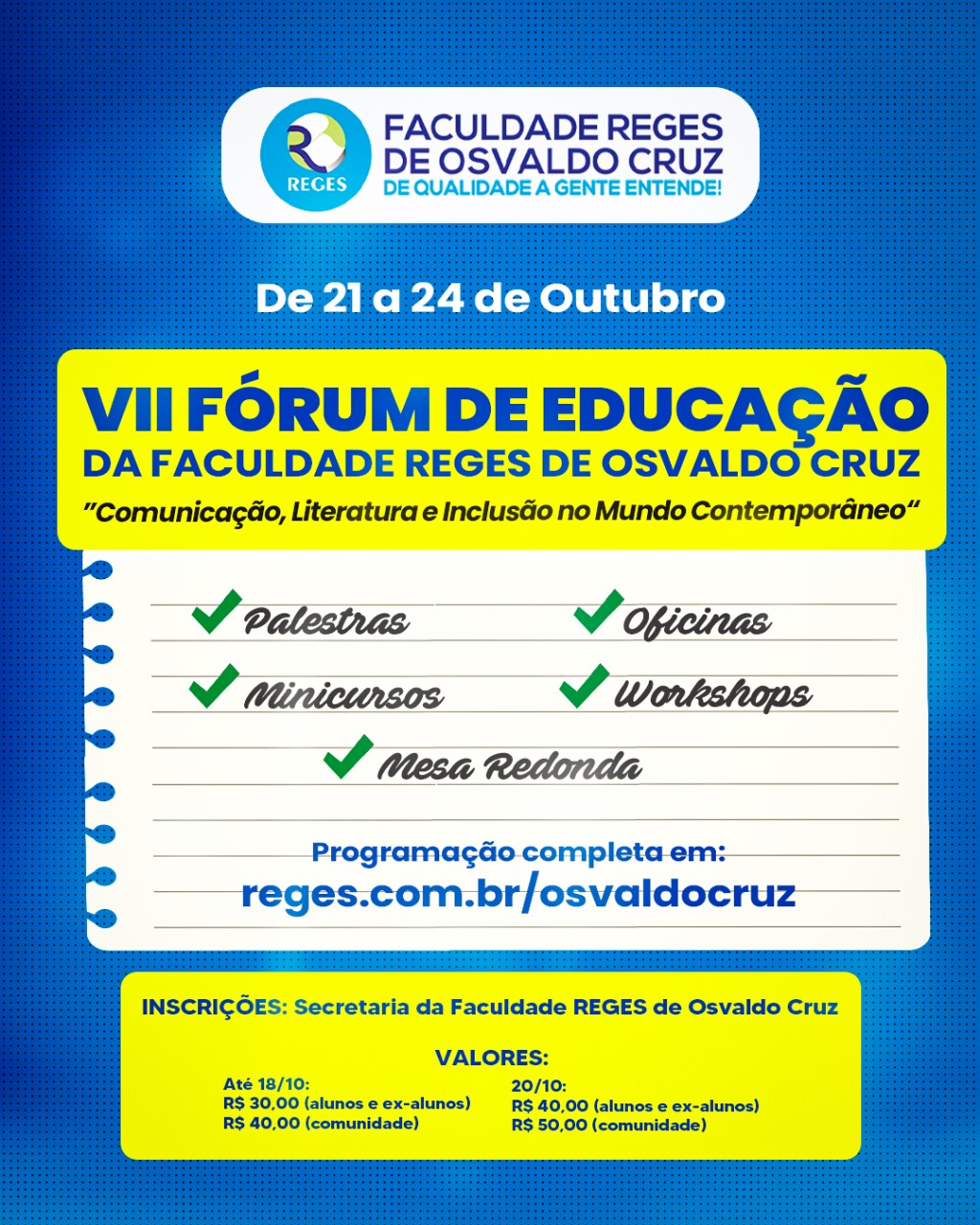 NOTÍCIAS 17 Out 2025 FACULDADE REGES DE OSVALDO CRUZ PROMOVE O VII FÓRUM DE EDUCAÇÃO PARA ESTUDANTES E PROFESSORES DA REGIÃO EVENTO PROMOVERÁ PALESTRAS, MINICURSOS, DEBATES, DENTRE OUTRAS ATRAÇÕES